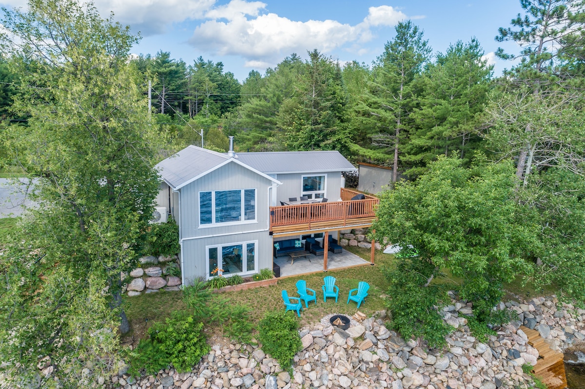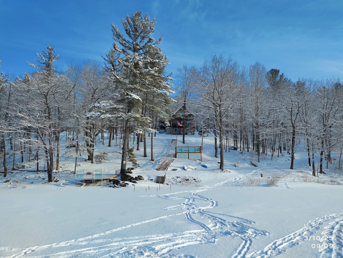 Relax with family & friends and enjoy this beautiful updated lakefront oasis in every season:). Spacious, bright open concept, fireplace, lrg deck, AC, radiant heat, smart TV, 100 ft waterfront, private beach!:) West facing, spectacular sunsets, panoramic views! Spring/ Summer hiking, fishing, camp fires and paddling! Amazing swimming, boating & memories to be made:) Winter skating, cross country & nearby downhill skiing, snowshoe, snowmobile (OFSC trails), ice fish, campfire s’mores & more!