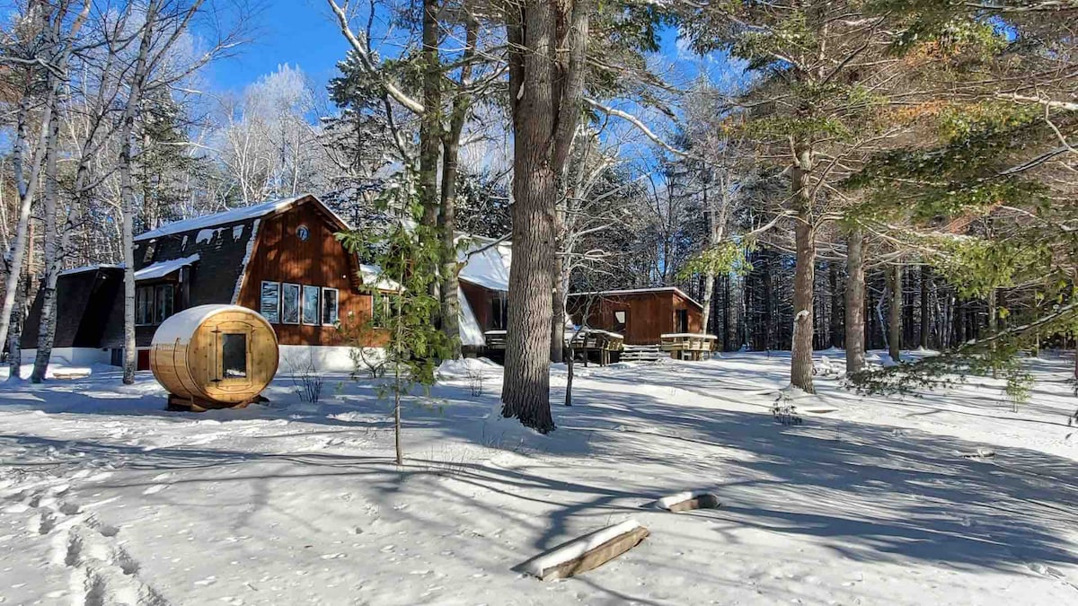 Come to Twilight Fox and enjoy sauna, hot tub, indoor fireplace all located in tranquil forest. Incredible nature experience in an elegant one of a kind cottage. Amazing Large A frame, barn house and bunk house all a part of one modern cottage. Cozy for couples romantic getaway but can accommodate larger groups/families as well. Immerse yourself in peace and tranquility of Incredible Madawaska River/Kamaniskeg . Unmatched peace of Algonquin like forest, and breathtaking water front.