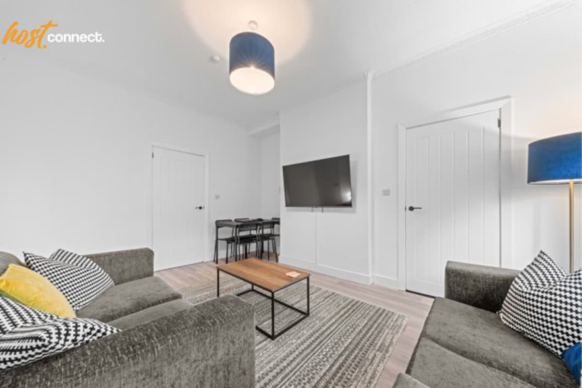 Enjoy a peaceful stay in this newly furnished, semi-detached home with a private entrance — perfect for older guests or those with mobility needs. only few steps near the main door. Fully equipped kitchen. Sleeps 6 guests: • Bedroom 1: 2 single beds • Bedroom 2: 1 double bed • Living room: Sofa bed for 2 Features a well-equipped kitchen, dining table for 6 in the living room, washer & tumble dryer, and access to a shared backyard. Comfortable and family-friendly with no steps inside.