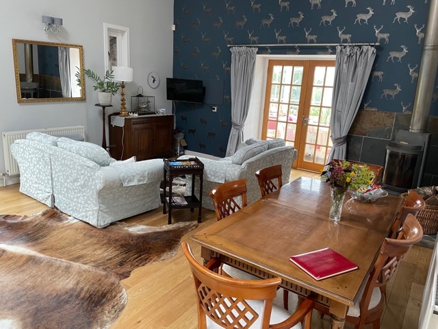Luxury self-contained converted barn with private entrance, patio and sauna. Also features a log burning stove to keep you cosy in the Scottish countryside. Secluded and peaceful yet in easy reach of Glasgow with fast public transport links a short taxi trip away. Enjoy panoramic views across fields and hills, dog secure private walled garden, modern fully equipped kitchen, spacious living area with comfy couches and dining table, and a wood-burning stove.