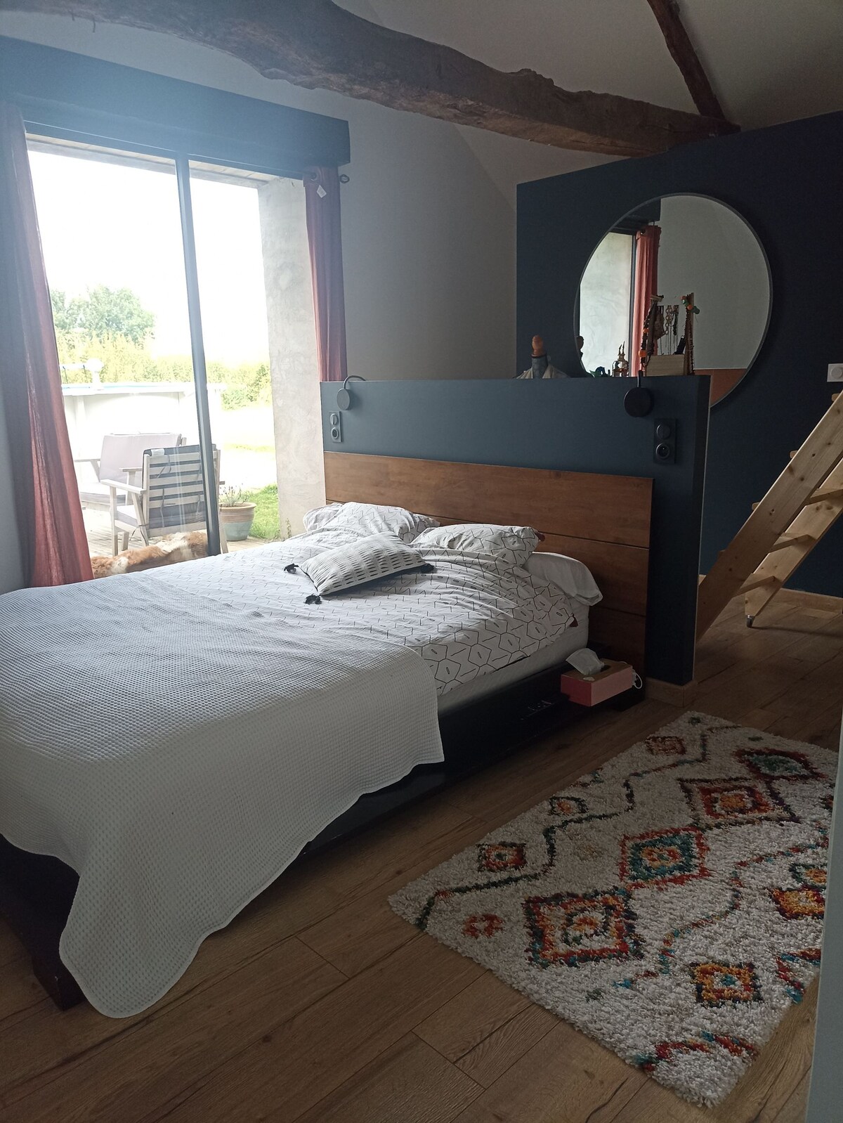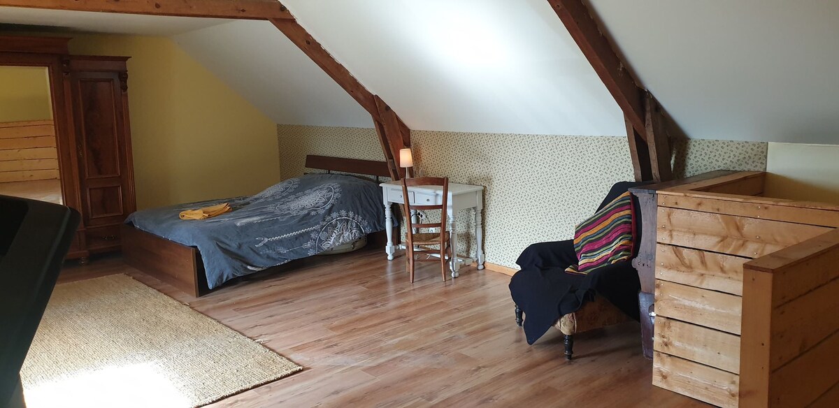 Bienvenue dans mon petit coin de paradis. Une chambre d'hôtes de 20 m2, un lit de 140/200 Salle de bain et wc privatifs. Au calme absolu dans une longère individuelle en terre et pierre du 18 éme siècle entièrement rénovée. Accès à la cuisine, 2 espaces repas, au jardin avec ses deux terrasses distinctes. La maison sans vis à vis se situe sur un terrain de 6000m2 avec verger et potager. Fruits en fonction de la saison. Elle se trouve tout en haut d'une colline avec vue sur le village au loin.