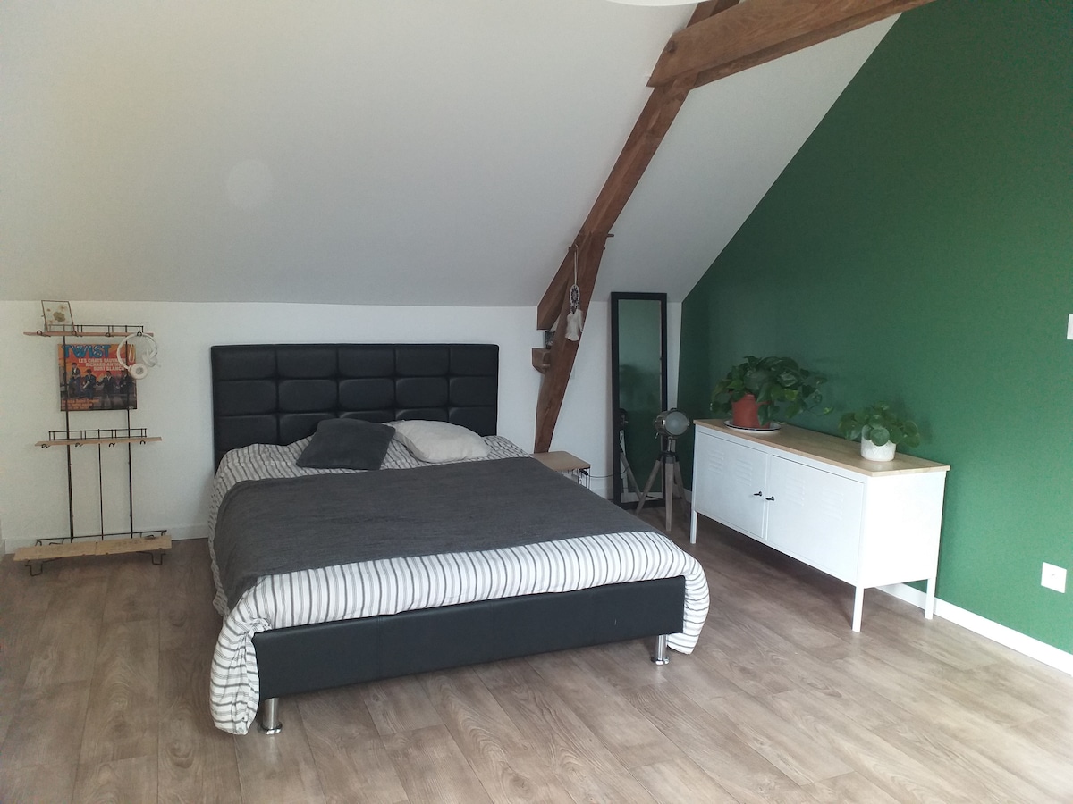 La chambre est équipée d'un lit double (140 cm), d'un bureau, d'une télévision, ainsi que d'un petit frigo et d'une bouilloire avec thé et café. Vous pourrez également profiter de votre salle de bain privative, ainsi que de WC séparés. Nous mettons également à votre disposition notre terrasse pour profiter du calme de notre maison située en pleine campagne. L'accès à la chambre est indépendant. Nous avons deux chiens et un chat, qui passeront peut être vous dire bonjour :)