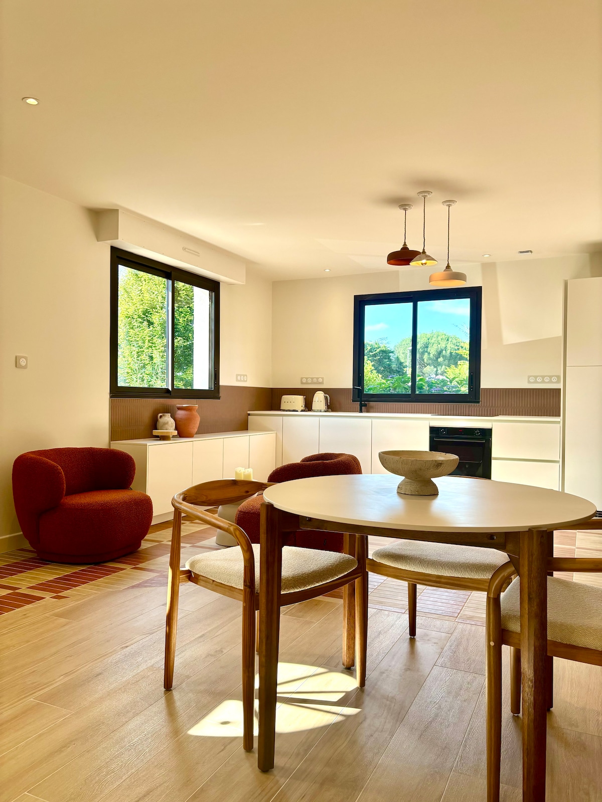 65 m2 de plein pied au fond de la propriété. Un havre de paix labellisé 3 étoiles. Suite parentale avec son coin salon de 27 m2, cuisine 15 m2 avec coin repas, chambre des enfants de 17 m2 Salle d'eau et wc séparé et la piscine couverte et chauffée à 29 degrés minimum toute l'année fait le bonheur des petits et des grands Nous avons tout l'équipement pour les bébés : jumeaux et triplés !