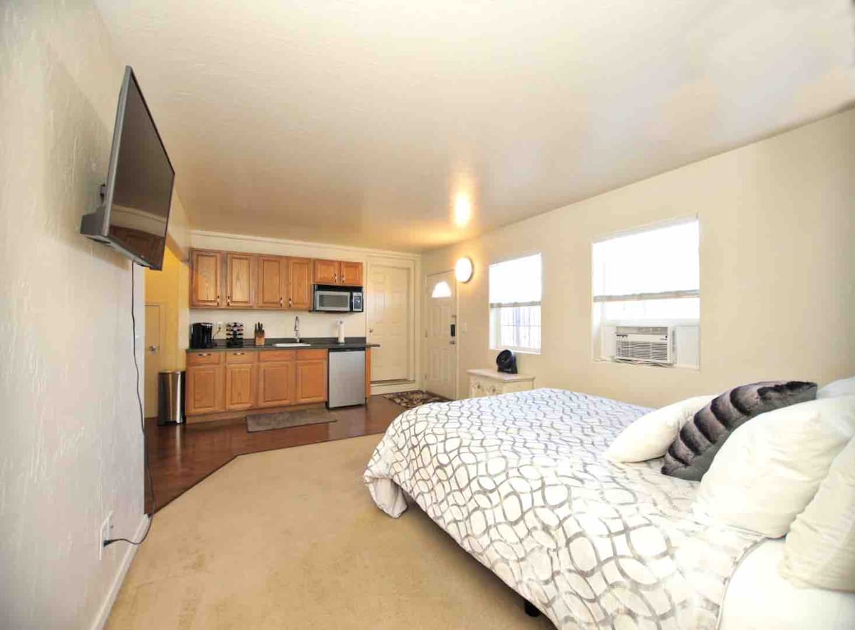 This clean, sanitized, and modern studio is perfect for all types of travelers! Precautions against Covid19. With a queen size bed that reclines, you can get the sleep you need after a day of adventure. The kitchenette is large and provides kitchen amenities and a lovely nook to enjoy eating/working/daydreaming. The bathroom is unique with a full size bath/shower and full service W/D. A walk in closet for all you fashionistas.