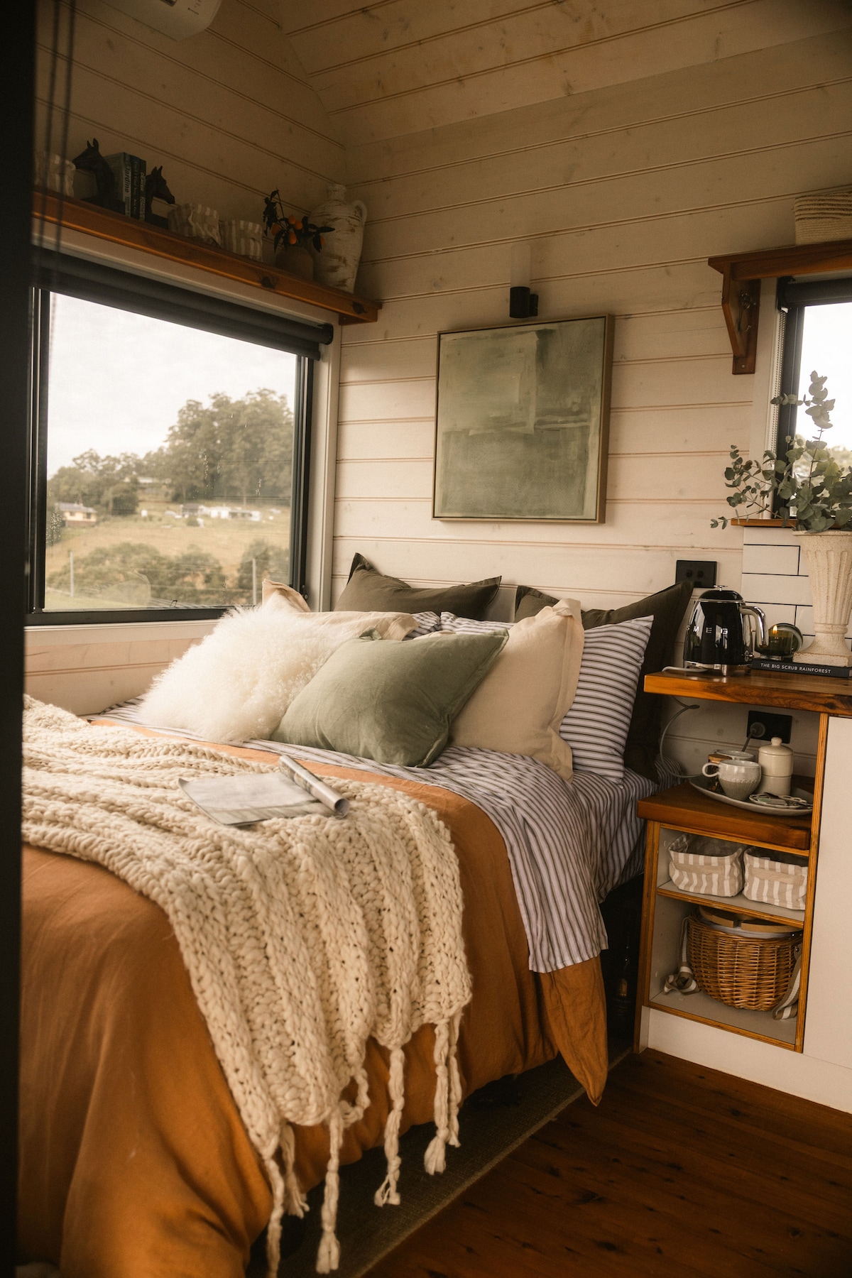 The Barn is a private space tucked away on 100 acres of rolling hills, rainforest, and macadamia orchards well away from the main house, with stunning views of the foothills of the Nightcap Range. A perfect spot to unwind, with peaceful walks to a secluded swimming hole and waterfall. You’ll share the land with wallabies, echidnas, donkeys, goats, a cow, 3 calves and our friendly green frog, Frankie. A short drive to Clunes, Federal, and Bangalow, it’s a quiet escape to rest and recharge.