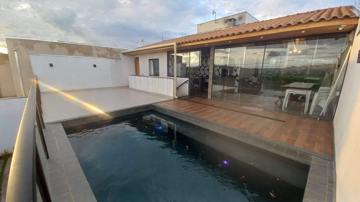 Uma casa arejada, com piscina aquecida por aquecedor solar e área de lazer, cozinha espaçosa com churrasqueira, ventiladores de teto nos quartos e garagem que acomoda dois carros,compartilhada com o dono do imóvel e sujeito à manobra. Localizada na região central de Alpinópolis, perto de praças e do Parque de Exposições, vizinhança tranquila e familiar. A casa hospeda até 6 pessoas em camas e 6 pessoas em sofás cama.Possui duas camas queen e duas de solteiro, dois banheiros, 2 salas e cozinha.