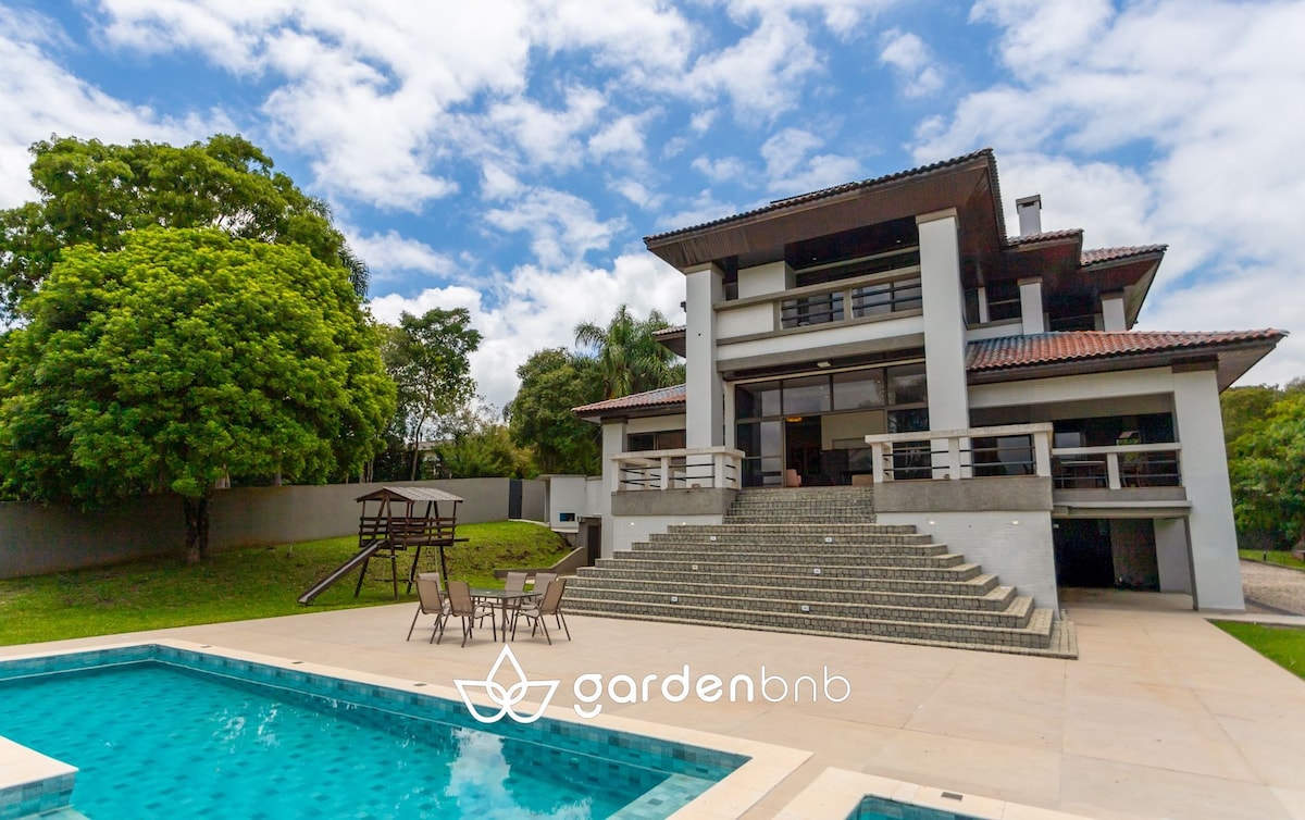 Experimente luxo e tranquilidade nesta casa exclusiva no Passaúna, a apenas 15 minutos da Volvo. A área externa é privativa e cercada e conta com piscina aquecida, quadra de beach tenis, campo de futebol, parquinho infantil e amplo jardim com vista para o lago. São 4 suítes com ar-condicionado, sala TV com ar condicionado e lareira, escritório, cozinha completa e internet 500MB. Churrasqueira com vista. Ideal para famílias e grupos que buscam conforto e natureza, com segurança e privacidade.