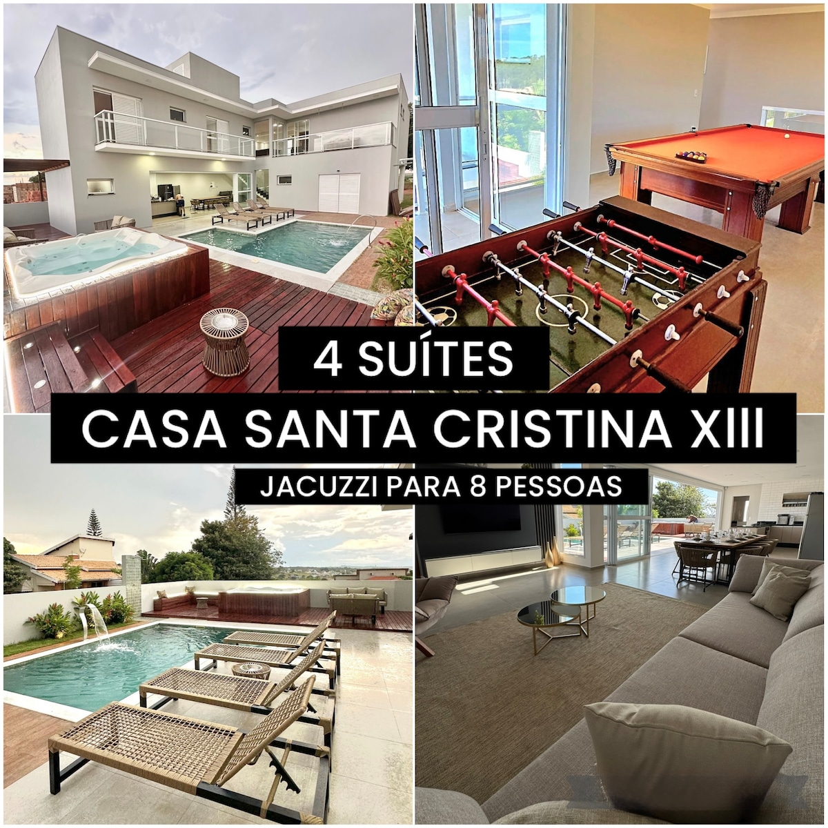 Riviera de Santa Cristina XIII 04 dorm (02 suítes com ar condicionado) Piscina e fireplace Espaço gourmet todo integrado com churrasqueira, sala TV com lareira área superior com SPA 7 lugares * Acesso aos clubs só com Dayuse. (consulte valores) A casa está localizada em área rural, sendo a rua sem pavimentação . Por tanto, considerar a poeira que vem da terra antes de finalizar sua reserva. Observar ainda que pode ocorrer presença de insetos, mesmo a casa contando com dedetização periódica