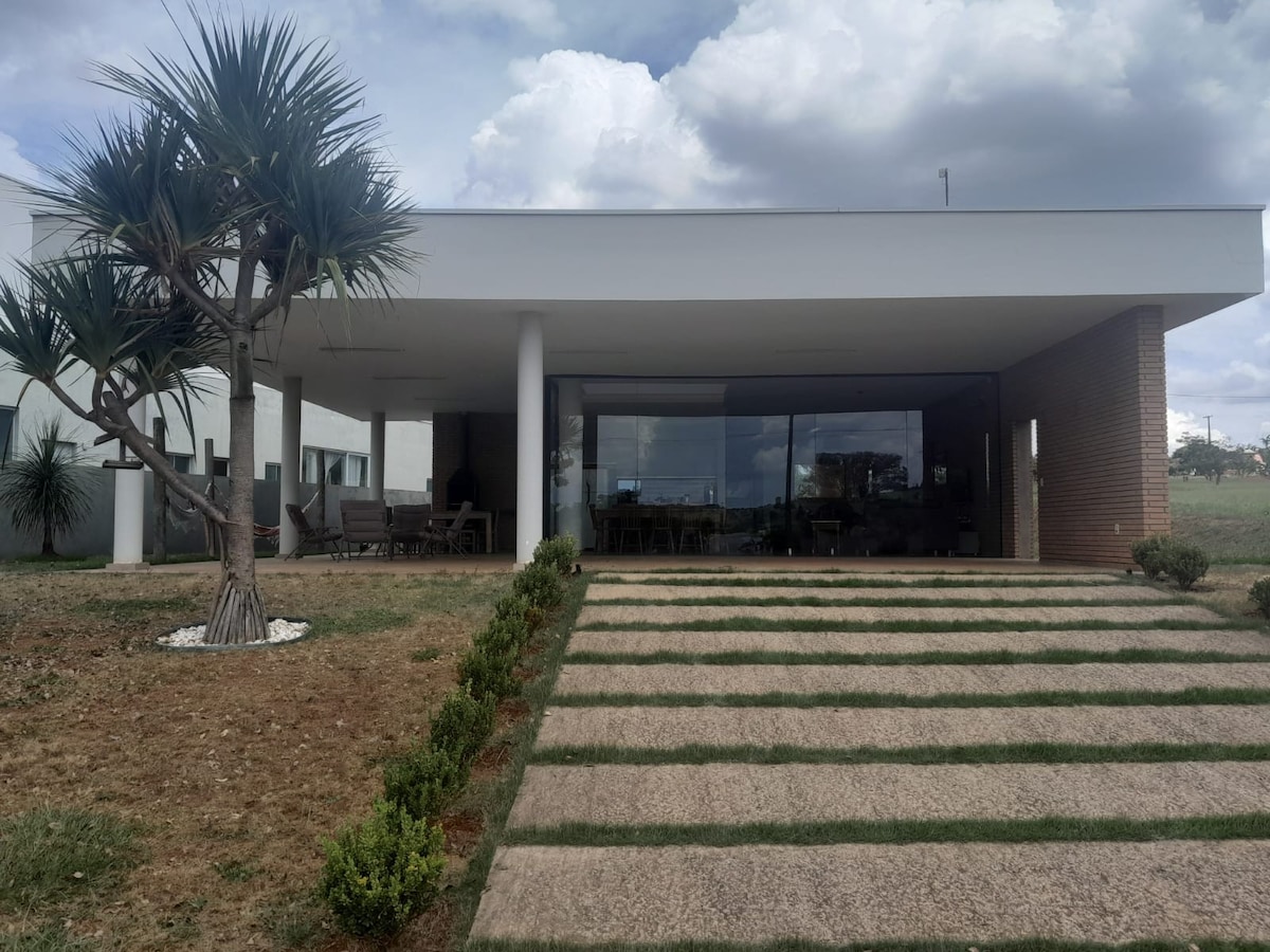 Spacious house, on the edge of the dam, in a gated community with only 28 lots. A project carried out by Ambienta Arquitetura (prestigious by the magazine Arquitetura e Construção and others) with 3,900 m2 of land, 516m2 built, a standard pool, and a smaller heated pool (electric heater), trampoline, slackline, kayak, stand up paddle and barbecue. 5 suites (all with air conditioning) and another toilet. Capacity to comfortably accommodate 14 people plus a baby.
