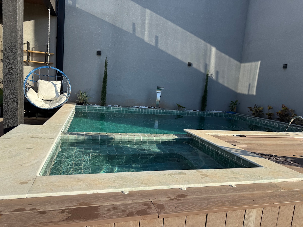 Spacious house, on the edge of the dam, in a gated community with only 28 lots. A project carried out by Ambienta Arquitetura (prestigious by the magazine Arquitetura e Construção and others) with 3,900 m2 of land, 516m2 built, a standard pool, and a smaller heated pool (electric heater), trampoline, slackline, kayak, stand up paddle and barbecue. 5 suites (all with air conditioning) and another toilet. Capacity to comfortably accommodate 14 people plus a baby.