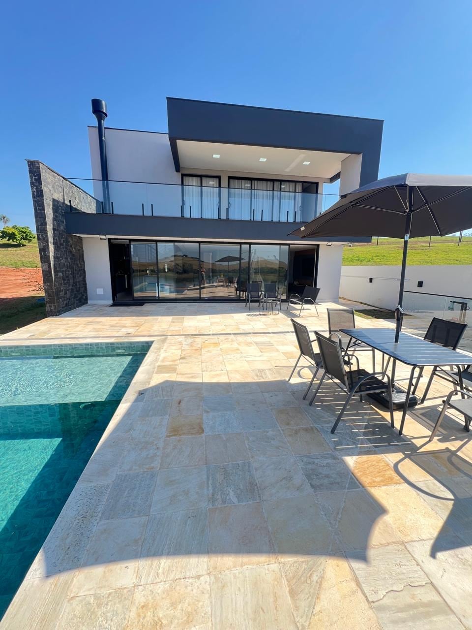 Spacious house, on the edge of the dam, in a gated community with only 28 lots. A project carried out by Ambienta Arquitetura (prestigious by the magazine Arquitetura e Construção and others) with 3,900 m2 of land, 516m2 built, a standard pool, and a smaller heated pool (electric heater), trampoline, slackline, kayak, stand up paddle and barbecue. 5 suites (all with air conditioning) and another toilet. Capacity to comfortably accommodate 14 people plus a baby.
