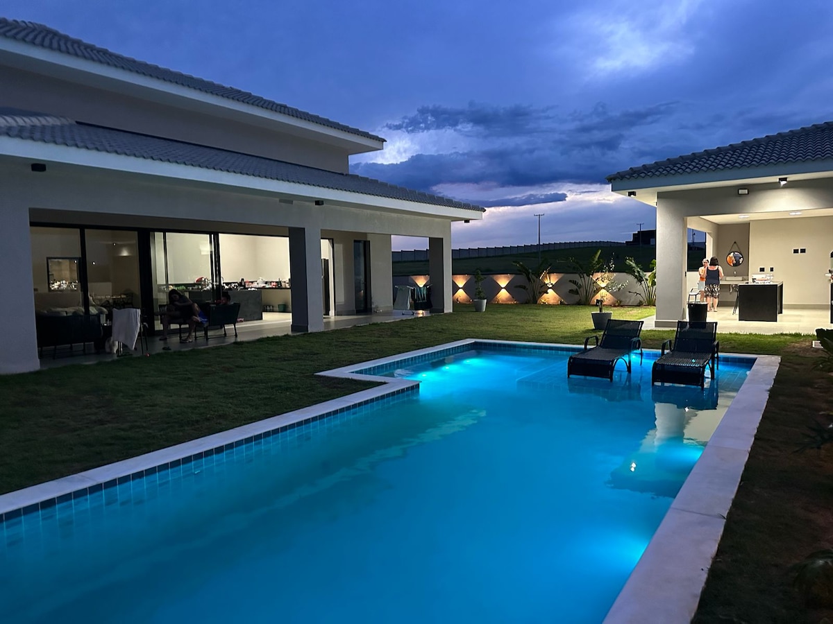 Casa maravilhosa, muito espaçosa e confortável com com 300m2 de area construida, sala enorme com 60m2. Toda equipada com ar condicionado nas salas e nos quartos. Área gourmet completa, com churrasqueira motorizada, forno a lenha, e geladeira extra. Piscina grande, com aquecimento central através de um sistema moderno de trocador de calor que aquece a piscina a 30° (é só avisar p ligar antes) Em outras notas e detalhes, leia sobre a utilização dos clubes, que são controlados pela administradora