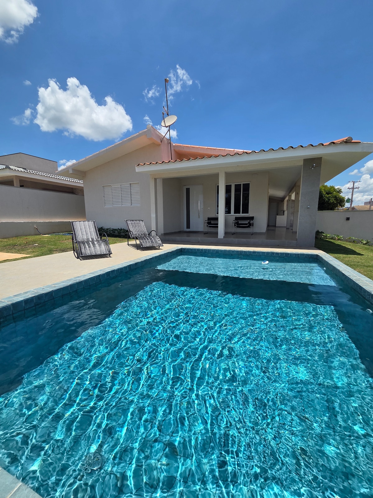 Piscina com cascata 3 quartos, sendo 2 suites Acomoda um total de 14 pessoas, 10 em camas, 2 em sofá-cama e 2 em colchões. Rua com asfalto Clubes pago a parte R$ 70 por pessoa em média Fica no setor Marina, perto da represa ao lado da rampa de acesso, parque da orla e clube Marina Cozinha equipada desde de eletrodomésticos modernos até talheres e copos Filtro com agua gelada Check-In/Out flex Ar condicionado em todos os quartos Piscina, churrasqueira e fogão a lenha TVs smartr
