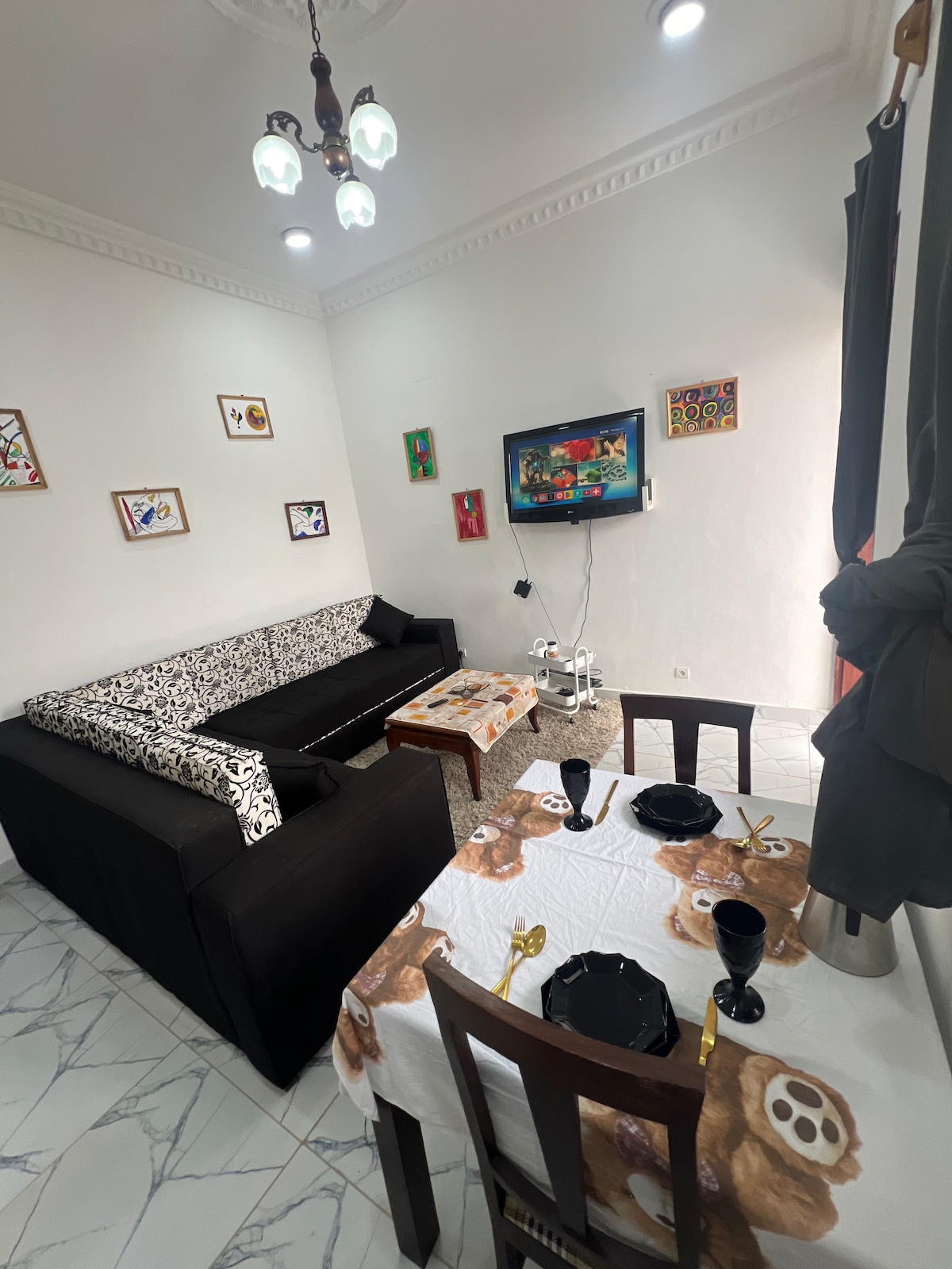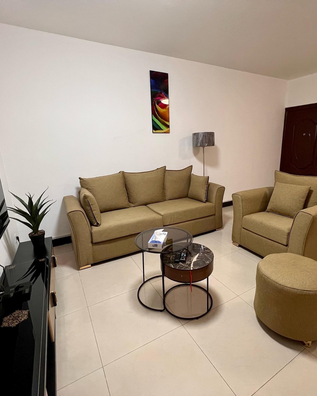 This modern apartment in Poto-Poto, Brazzaville, offers style and comfort. The bright living area features a sleek leather sofa, smart TV, and elegant décor. Large windows bring in natural light, and air conditioning ensures a cool stay. Perfect for business travelers or couples, this chic space provides a premium experience in the heart of the city.