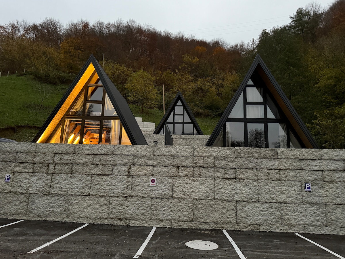 Stay in our cozy A-frame cabin, tucked in the hills just 3 km from the M20 road in Tjentište, right inside Sutjeska National Park. You're on the route to Maglic, the Perućica primary forest, and Trnovačko Lake, perfect for hikers and nature lovers. The cabin sleeps 2-4 guests (plus a sofa for a 5th), with a private bathroom, kitchenete, and free parking. A local restaurant (Outdoor Tara) is just 50m away, serving homemade meals all day. No WiFi-just birds, fresh air and a breathtaking view.
