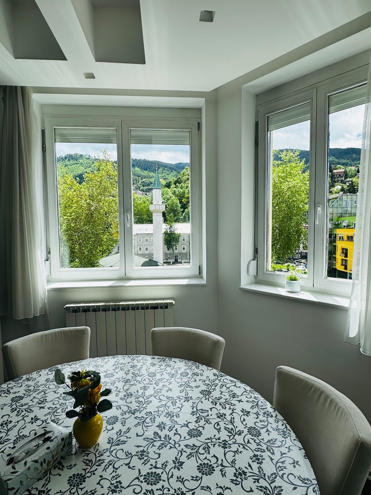 Omar’s view apartment is located in the heart of Sarajevo’s old town, a very quite area with only 5 minute walk to the main Bascarsija square (Sebilj). The apartment consists of two bedrooms, living room and eating area with kitchen. It has two bathrooms. You can enjoy the breathtaking view on Sarajevo from three terraces. Within the property there is a parking space, suitable for two cars, surrounded by high walls, so your privacy is ensured.
