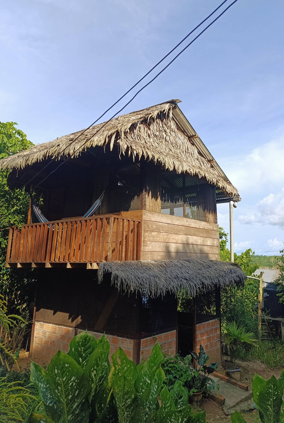 This beautiful new cabin, with its stunning river view, offers an incredibly tranquil setting. Equipped with a desk for work, 24-hour access to high-speed satellite internet, a hammock for relaxation, a private toilet, and an outdoor shower - this space is perfect for one person. Just a 2-minute stroll to a fully equipped kitchen, this space is truly a place of peace and beauty, nestled amongst the jungle flora. We are located just a 5-minute motokar - or a 15-minute walk away from Nauta.