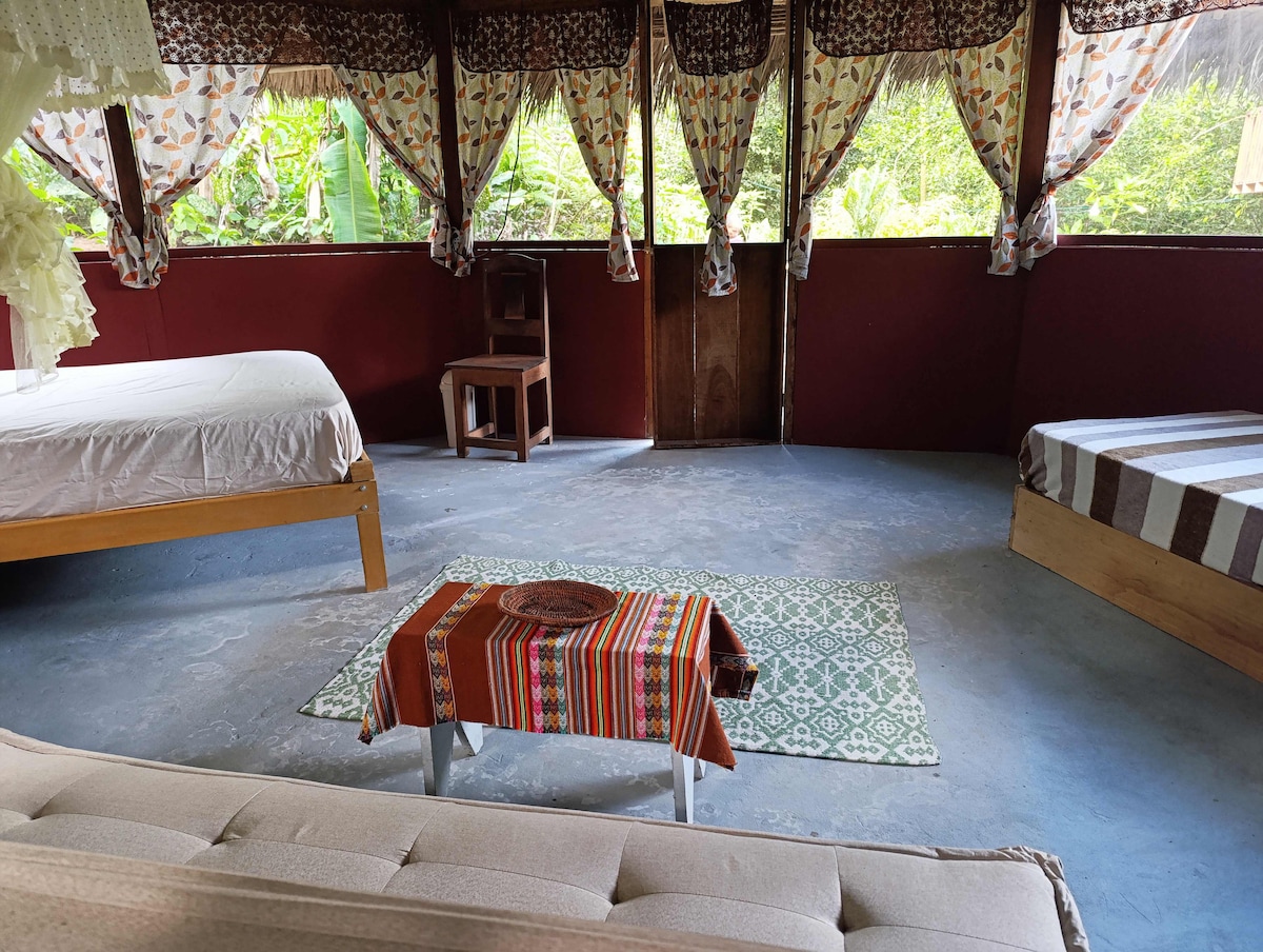 Confortable private house surrounded by jungle..spring matrace to rest well..futon with table downstairs.. 220V solar system..WIFI (STARLINK) Short walking distance access to shower and bathroom .. shared chill area indoor .. gym .. Maloca with indoor fire pit .. terrace with 9000L swiming pool (natural bit of leaves and algae) Located out of town in jungle .. access to town walking or mototaxi 10 minuts You can see monkeys spiders and other jungle creatures around here in its natural habitat