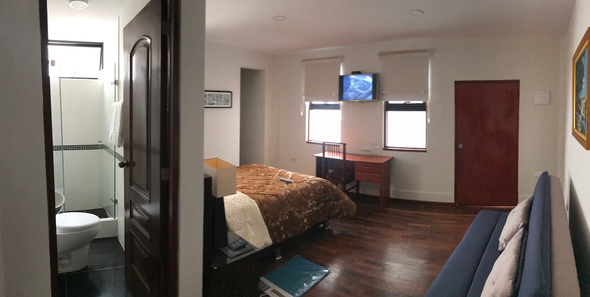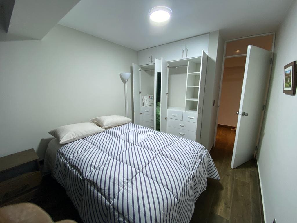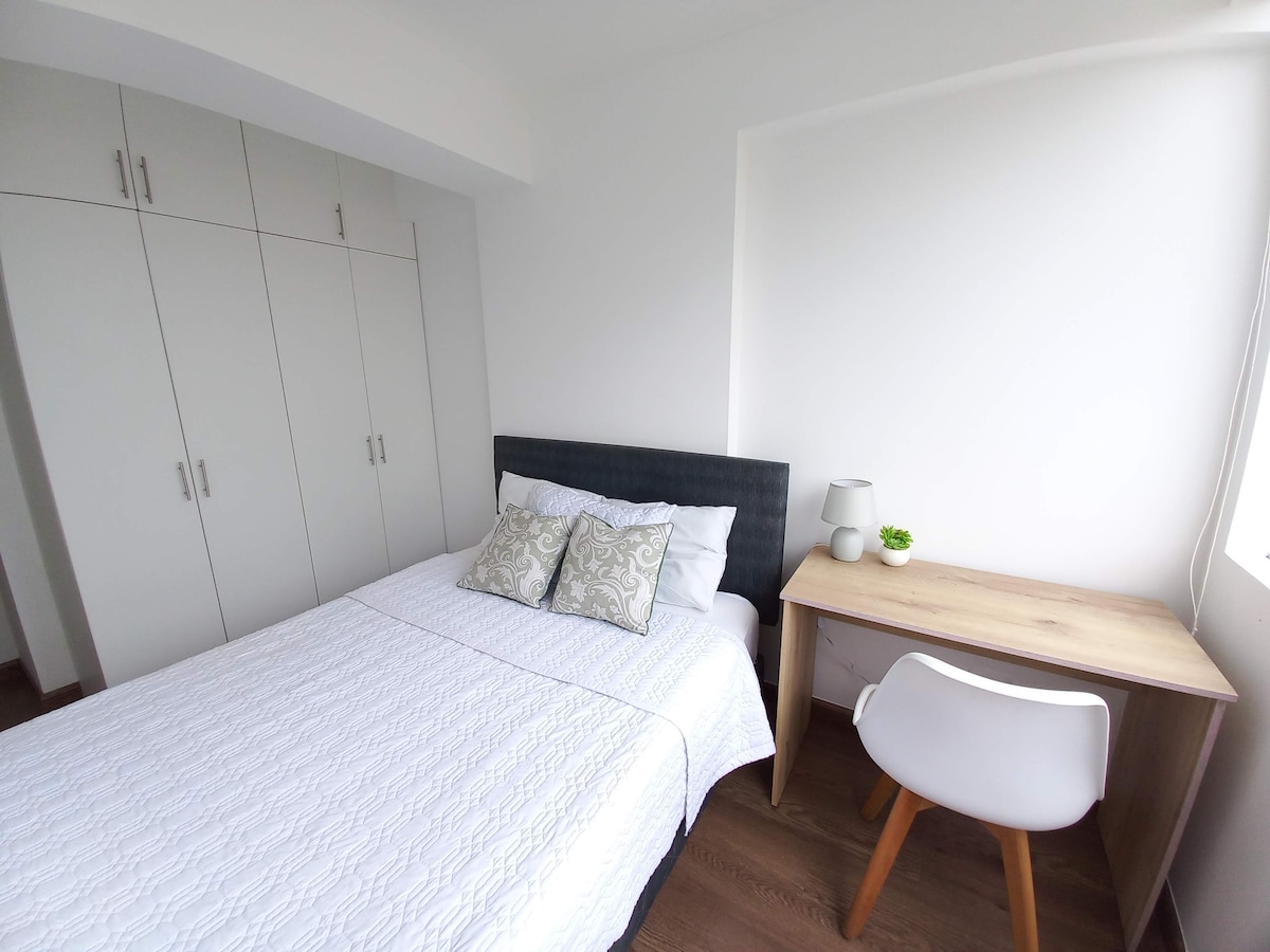 Acogedor departamento ideal para familias pequeñas. Ubicado en una zona segura. Cuenta con habitación privada con TV, baño personal y ropero. Cocina equipada con minibar, cocina a gas, lavadora y barra para comer. Comedor pequeño con ventana y TV adicional. Incluye cama plegable para un tercer huésped. Buena ventilación con dos extractores de aire, con agua caliente, WiFi, TV cable y área de parrilla junto a un jardín ideal para comidas al aire libre. ¡Reserva ahora y vive una escapada perfecta!