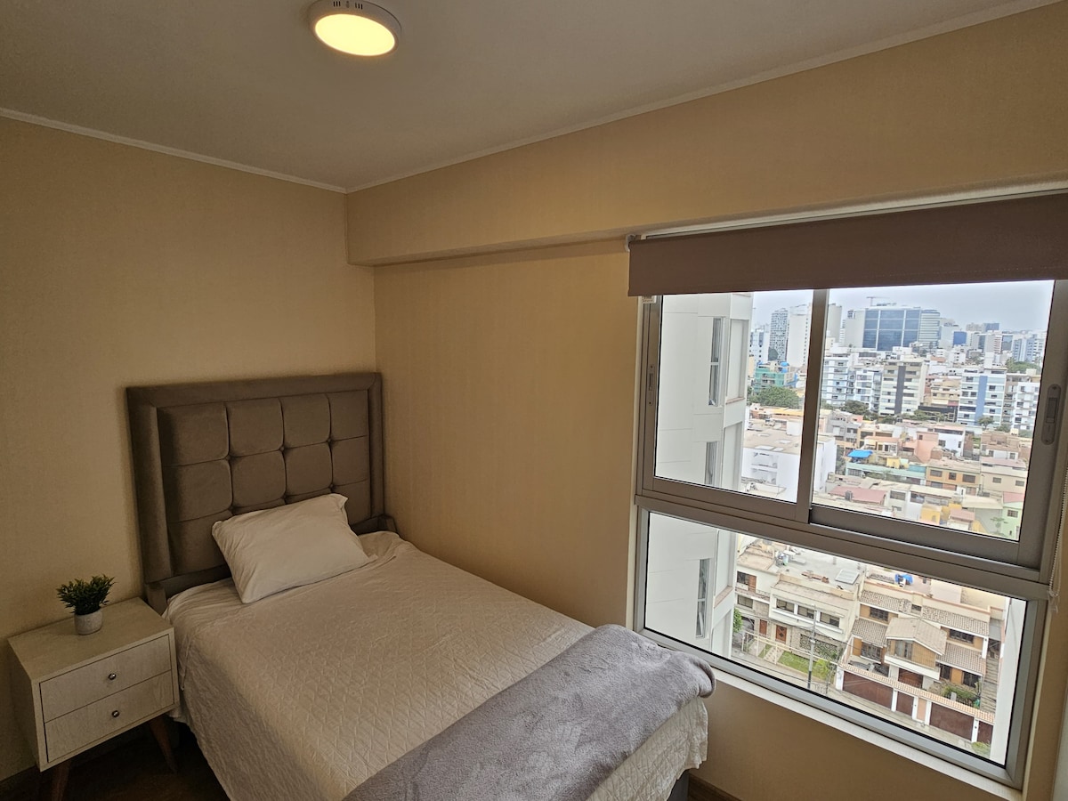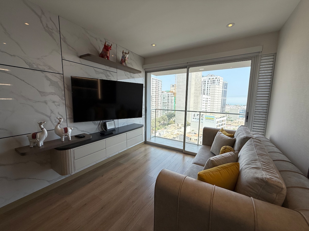 Departamento de estreno completo totalmente equipado que esta ubicado en una zona estratégica de avenida principal en Lima, Perú. Con áreas comunes en el edificio para que hagan de tu estancia una experiencia única. Está creado con la intención de ofrecer un espacio cálido y acogedor a mis huéspedes, además de unas vistas panorámicas excepcionales que te permitirán disfrutar de las puestas de sol y de la belleza de la ciudad.