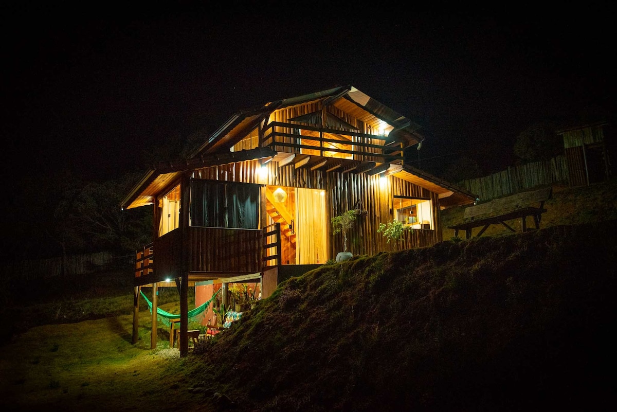 Relaxe em uma Cabana high-tech, moderna e cheia de estilo, cercada por uma vista linda e uma natureza exuberante. A cabana possui Ar condicionado , Alexa, cama Queen, TV smart, WiFi, cozinha completa, banheira de imersão, banheiro completo, lareira calefator, uma varanda com móveis, com linda vista. Tudo que precisa para uma experiência completa em uma Cabana. A cabana é um sonho para casais que apreciam uma hospedagem de qualidade, ambiente reservado, tranquilidade e contato com a natureza.