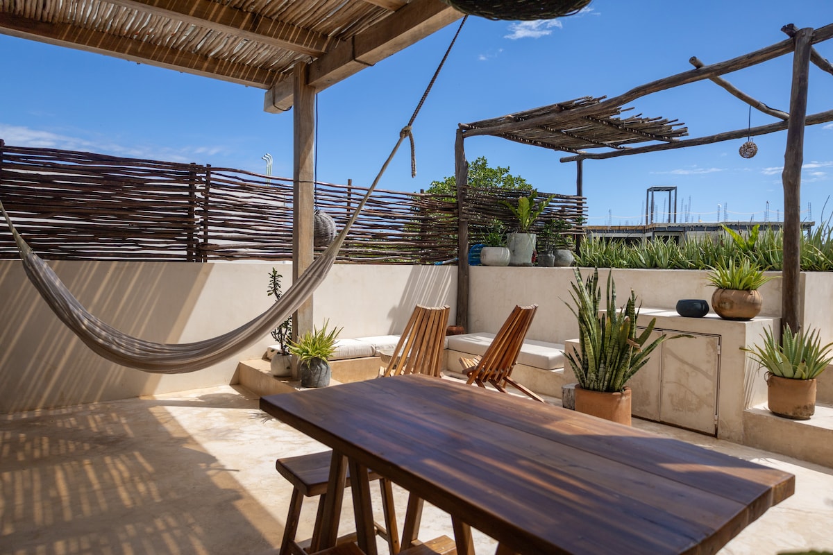 A luxurious rooftop suite in a two-unit villa, it's one of the finest in Tulum! Perfect for two people, featuring a king-sized bed, custom-made credenza, TV, a locally made mirror, full bath and a shower with rainwater shower head. Check out the fully furnished outdoor kitchen and dining area, as well as a private soaking pool from which to watch the gorgeous sunsets. It's a short walk to Tulum Centro (downtown), and only a 15-minute bike ride to the beach.