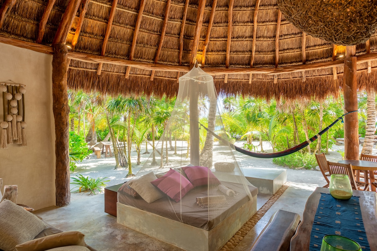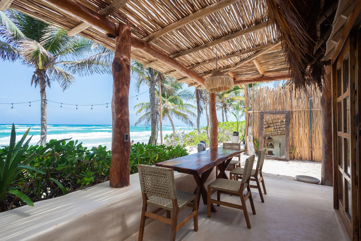 BEACH FRONT ! In the heart of tulum beach road. Open your bedroom window and step into the sand.... It's doesn't get better than this. Luxury is a morning coffee, facing the water at sunrise and from your own place. The hardest choice is whether you will go for a morning dip first or coffee. The property holds a private beach, ideally located just between two famous hotels. At night you can wander around the beach road and all it's famous restaurants and shops. This property is a GEM.