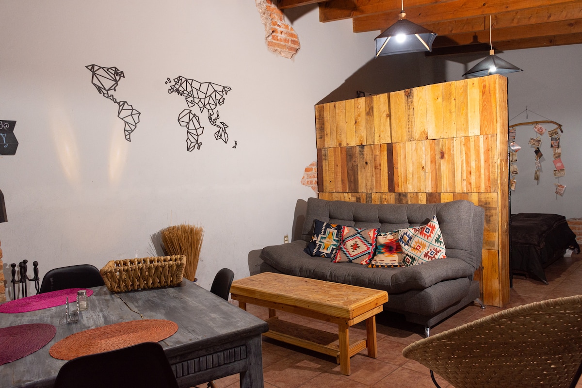 loft with all private services, parking (1 within the facilities), bathroom, kitchen, fireplace, sofa bed, desk, double bed, closet. good location, 5 minutes to supermarkets, boulevards(Bernardo Quintana, University, Feb 5), restaurants, banks, CrossFit, gym, Parks, tacos, hamburgers, food trucks,organic street markets, malls. ideal for executives, resting. it has an outdoor table under a guava tree and pomegranate mmm barbacue is available