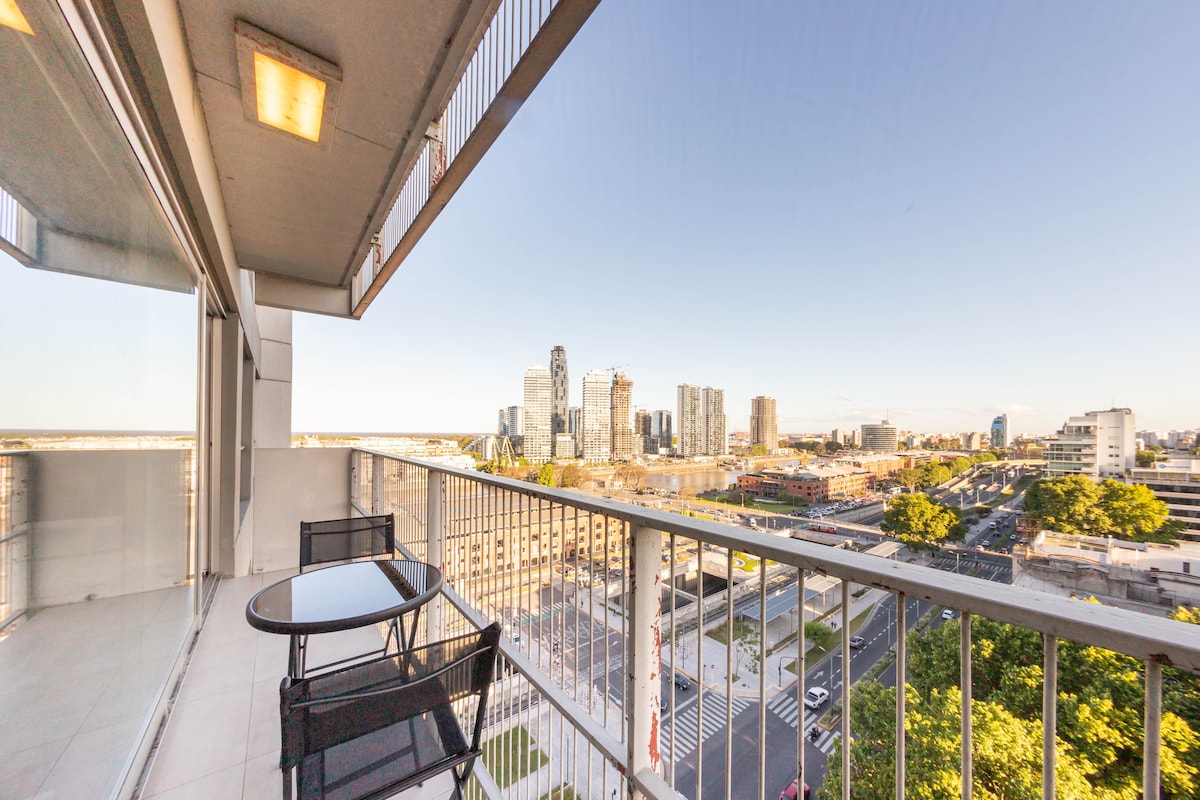 Brand new two rooms apartment. Fully furnished and equipped. In the fanciest neighbourhood of Buenos Aires: Puerto Madero . Located on the 12th floor has an amazing view to the river and the city skyline. It is quiet and comfortable. The area is safe and full of restaurants and sights worth visiting. The location is very convenient. It is within walking distance from Plaza de Mayo. This neuralgic point of Buenos Aires is connected by several public transportation means to the rest of the city.