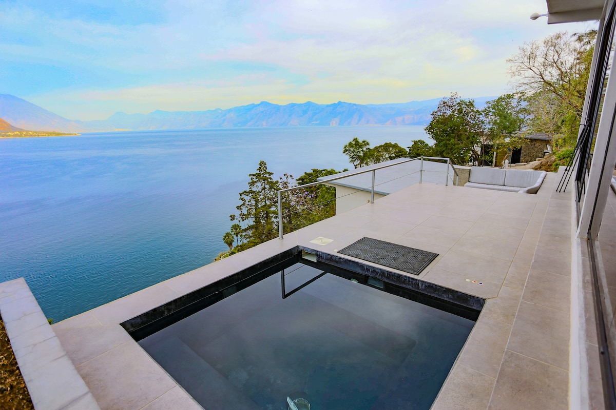Very Unique & Modern Luxury House up in the Guatemalan Highlands with the sensation of floating up in the sky (1700m) -Features unobstructed Starlink connection with 24 hours of unbroken electricity (lithium/solar) -All windows folds fully open to greet the breathgiving views of 5 vulcanos and the “infinity lake” of the ever changing “painting” -Filtered spring water on tap -Bathroom hot tub for a closed or open door experience -12 m2 cantilevered hammock deck-net for stargaze & relaxation