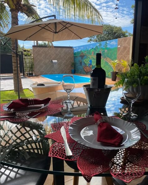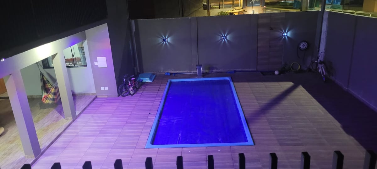 Relaxe com toda a família nesta acomodação tranquila. Chácara molhada em Alvorada do Sul - Três suítes; - Ar condicionado em todos os quartos; - 4 Colchoes de solteiro; - Banheiro social; - Espaço Gourmet com sala integrada; - Duas geladeiras; - Micro-ondas; - Liquidificador; - Fogão cinco bocas; - Utensílios de cozinha; - WI-FI; - Câmera de Segurança parte externa; - TV; - Piscina com prainha e Hidromassagem; - Acesso ao rio; - Pier flutuante para pesca; - Espaço para veículos;