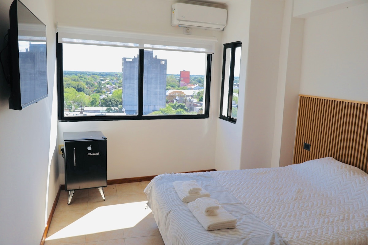 Amplio monoambiente con una vista excepcional de la ciudad. En pleno centro, cerca de todos los sitios principales de la ciudad de Resistencia, a una cuadra de la plaza principal. Completamente amoblado y equipado. WiFi de alta velocidad. Baño equipado con bidet y ducha, toallas para los huespedes, secador de pelos, shampoo. Cocina equipada con heladera con freezer, microondas, pava electrica y todo el juego de vajilla. Aires acondicionado frío/calor