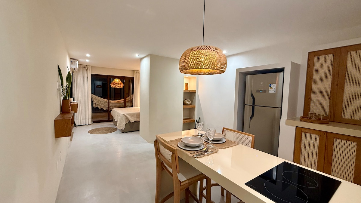 Luminoso mini apartamento, tipo loft, recém construído e decorato (dezembro 2023), totalmente equipado; cozinha completa, cama queen-size, sofá cama, Smart TV 43`, ar condicionado, e wi fi. Perfeito para quem curte vida de praia, localizado na terceira praia a 1 minuto do mar, é o lugar certo para ficar em Morro; perto de supermercados, bares, restaurantes e ao agito da segunda praia, mas num lugar tranquilo para descansar.