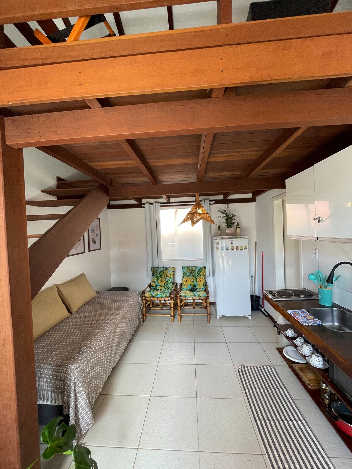 Em Morro de São Paulo, luminoso mini-apartamento, tipo loft, recém reformado e decorato, totalmente equipado; cozinha completa, Smart TV 32`, ar condicionado, wi fi e varanda com vista jardim. Perfeito para quem curte vida de praia, localizado na terceira praia a 1 minuto do mar, é o lugar certo para ficar em Morro; perto de supermercados, bares e restaurantes, mas numa tranquila área residencial.