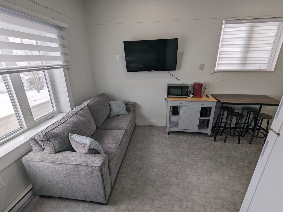 A cozy studio with kitchenette to relax and unwind in after a long day, whether you are here for hockey (1 minute drive to civic center), skiing or extreme mountain biking (8 minutes to Sugarloaf park), or for work at the hospital (4 minutes), the beautiful Restigouche River or any of Campbellton’s beautiful attractions. This unit is on the ground floor. A pay washer and dryer are located upstairs. There is one queen bed in the unit and one pull out couch. One parking space is provided.