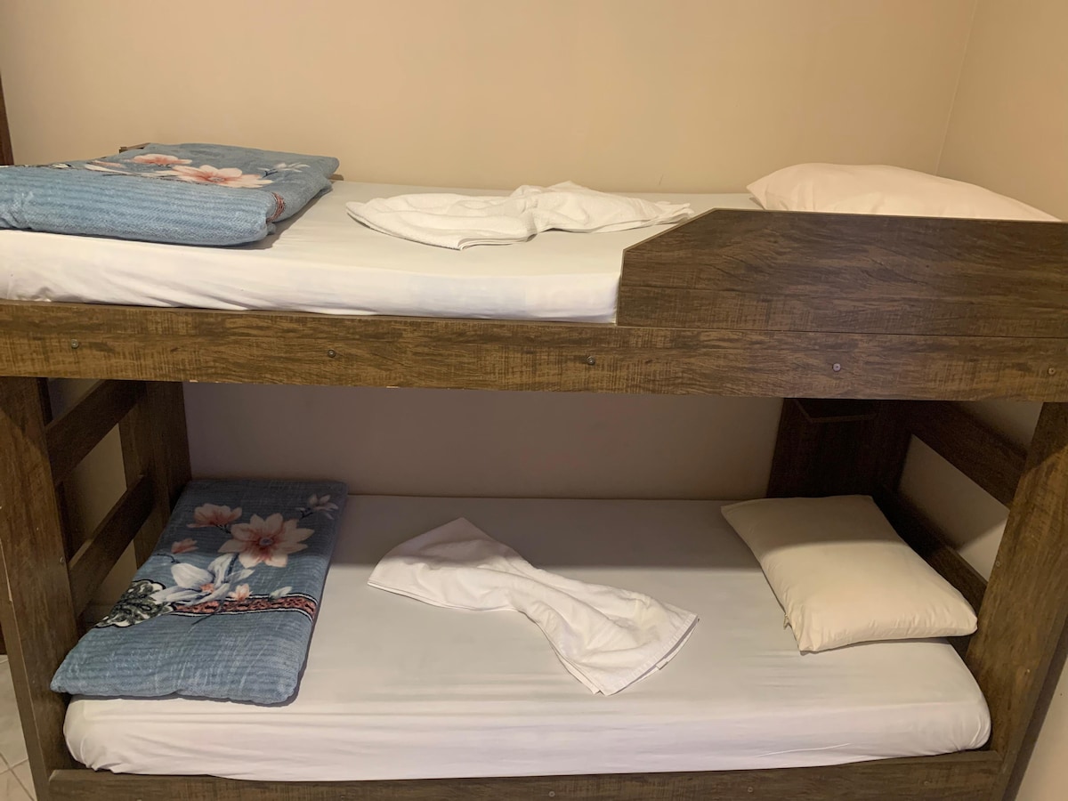 Suíte com ar condicionado para até 4 pessoas, equipada com 1 cama de casal e 1 beliche.