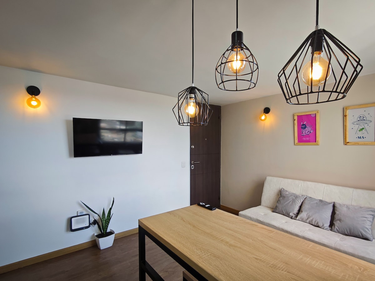 Acogedor apartamento, el cual cuenta con cama doble, televisor, escritorio, sofá, armario, baño privado y cocina con todos los implementos y electrodomesticos necesarios para uso del huésped, todo nuevo. El conjunto esta ubicado en una zona muy central, cerca del centro historico e internacional, donde se encuentran los mayores atractivos de Bogotá. Con vias de facil acceso y sistemas de trasporte publico que conectan el centro con el aeropuerto y la terminal de transporte.