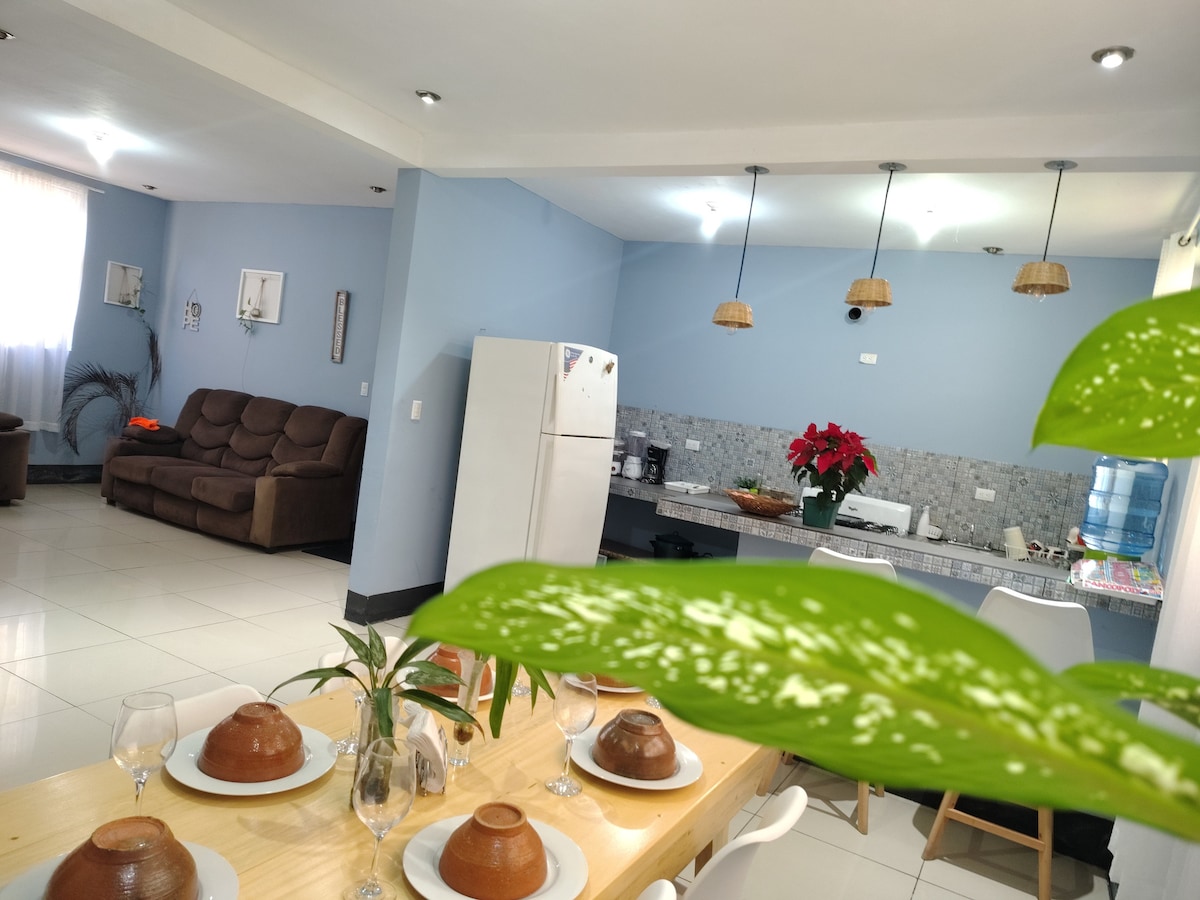 Casa Grande hasta para 20 personas, ubicada a 750 mts de los parques Xetulul y Xocomil. piscina exclusiva para el grupo, WIFFI ilimitado, parqueo para 4 vehiculos, área social, 6 dormitorios ( 5 con A/C), 5 baños, cocina equipada para cocinar y servir, área de churrasquera. son 2 niveles. La colonia es libre de delincuencia y hay tiendas con artículos básicos. Los supermecados y centro comercial con proveedores de comida rapida están a unos 4.5 km. en diciembre reservación mínima de 2 noches.