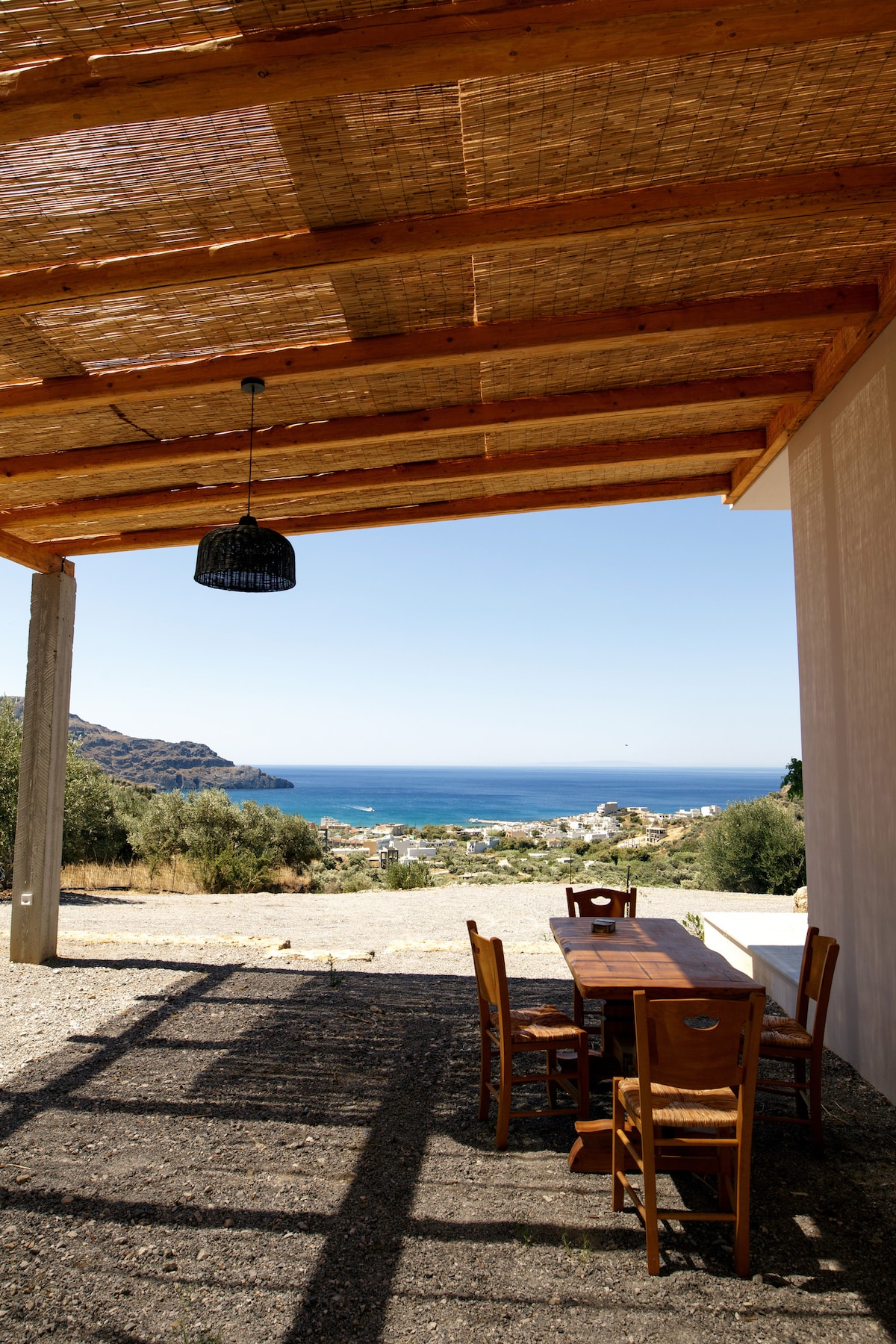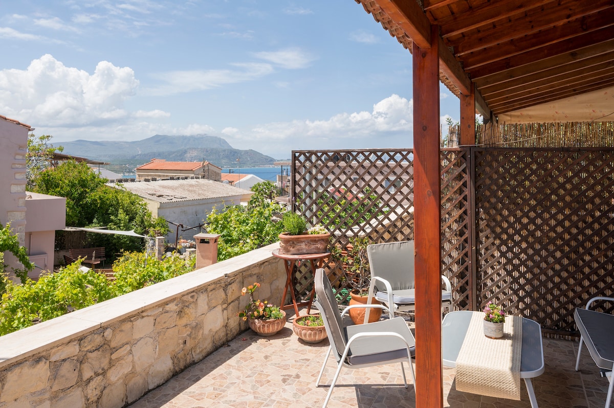 It's a wonderful country house located on top of a hill that overlooks the bay of Kalyves village.Its secluded in a an enclosed field without disruptions of the great view. Tranquility and nature at its best.The area of house is private and not house around. You can relax while listening to the waves and looking at the ships passing by in the horizon. It's a 5-10 minutes walk to the sea and village.