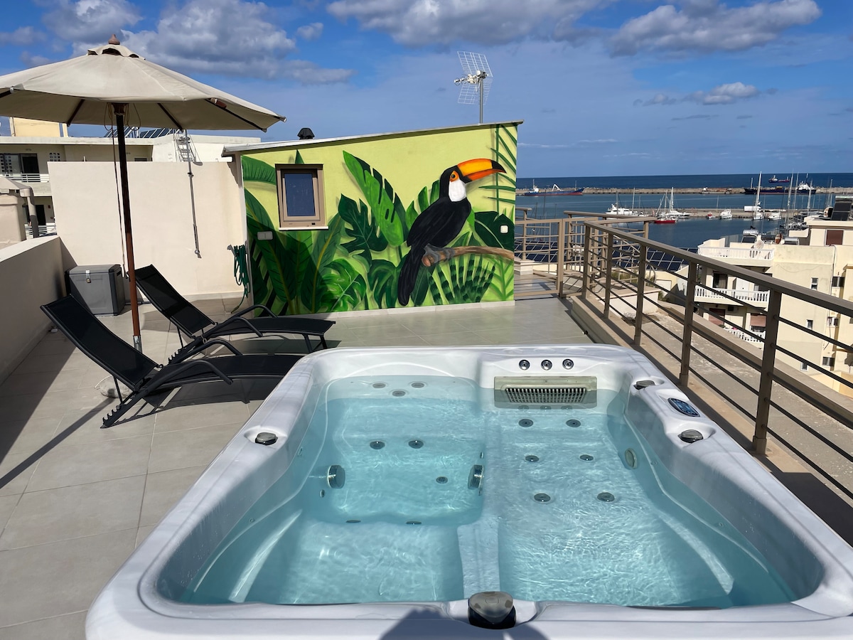 Harbour Hill Suite no. 8 (40 m2) is on the top floor of a block in the heart of Rethymno. It is a stylish bright suite some meters away from the beach, where you can relax on the spacious terrace enjoying your Jacuzzi ( out of order from 31st October to 1st April), overlooking the crashing waves. Breathe the sea breeze and enjoy the view of the Venetian Castle of Rethymno! Explore the beautiful city of Rethymno on foot and jump into the sea whenever you like.