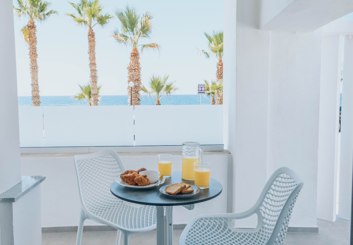 Opening to a spacious terrace overlooking the Cretan Sea, this 36 sq. meters apartment features a separate bedroom and a well-equipped kitchen with fridge and electric hobs. A 43' TV, a safe, free Wi-Fi, air-conditions on all rooms and free housekeeping every 3 nights are included.