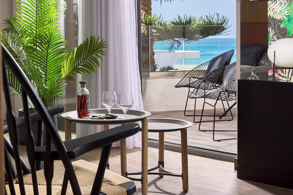 The Bohemian Junior Suite of KYMĀNI Boutique Hotel is a comfortable suite of 37 sq. meters. Its generous size, makes it a perfect option for longer stays. It can accommodate up to 3 guests and offers plenty of space for a comfy stay and a private balcony with view to the pool or the sea. A shared pool with sunbeds is available for all guests. Breakfast is available upon request.
