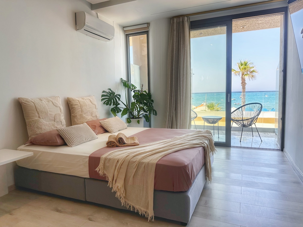 Welcome to Modern Seaview Studio of La Vie En Mer apartments the ideal option for your summer vacations in Rethymno. Unwind at this stunning Greek beachside Apartment. Our house was lovingly built with earth colors, Boho details, and brand-new electronic equipment for a luxurious yet charming feel. Enjoy the sea and the city views from our big balcony that offers an outstanding view of the castle and the sunset. The house is located on the beach road of Rethymno 10 meters away from the sand.
