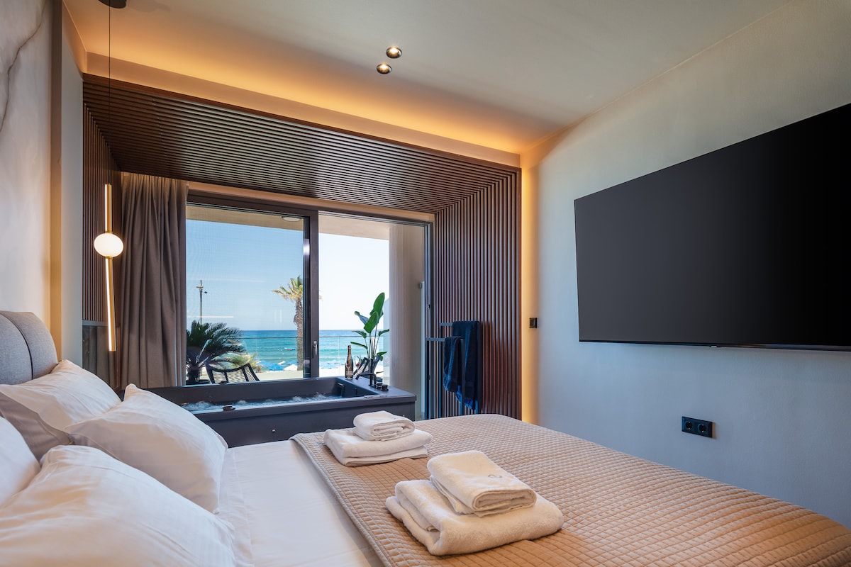 Experience the ultimate beachfront escape of LaVieEnMer apartments in our luxurious apartment located on the stunning beach road of Rethymno just 10 meters from the sea This brand-new apartment offers breathtaking sea views and an exquisite sunset panorama over the castle and the old city from the private balcony The highlight is the indoor jacuzzi next to the bed where you can unwind while gazing at the sea and listening to the relaxing sound of the waves Fully equipped with all amenities
