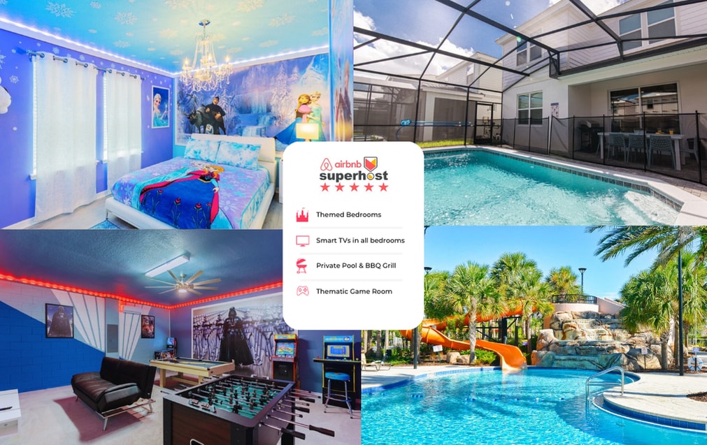The perfect balance of STYLISH DESIGN, LUXURIOUS COMFORT, & ENDLESS ENTERTAINMENT in the stunning 3.5 square mile Reunion Resort. You will have your own private pool, spa, movie theater - game room, 3 master suites, 3 incredible themed bedrooms (MARVEL, FROZEN II, NASA) for kids or adults, the latest Xbox Series X game station, a 2500 ft2 pool deck overlooking a beautiful forest and pond, fire pit, & billiards table, minutes to Disney.