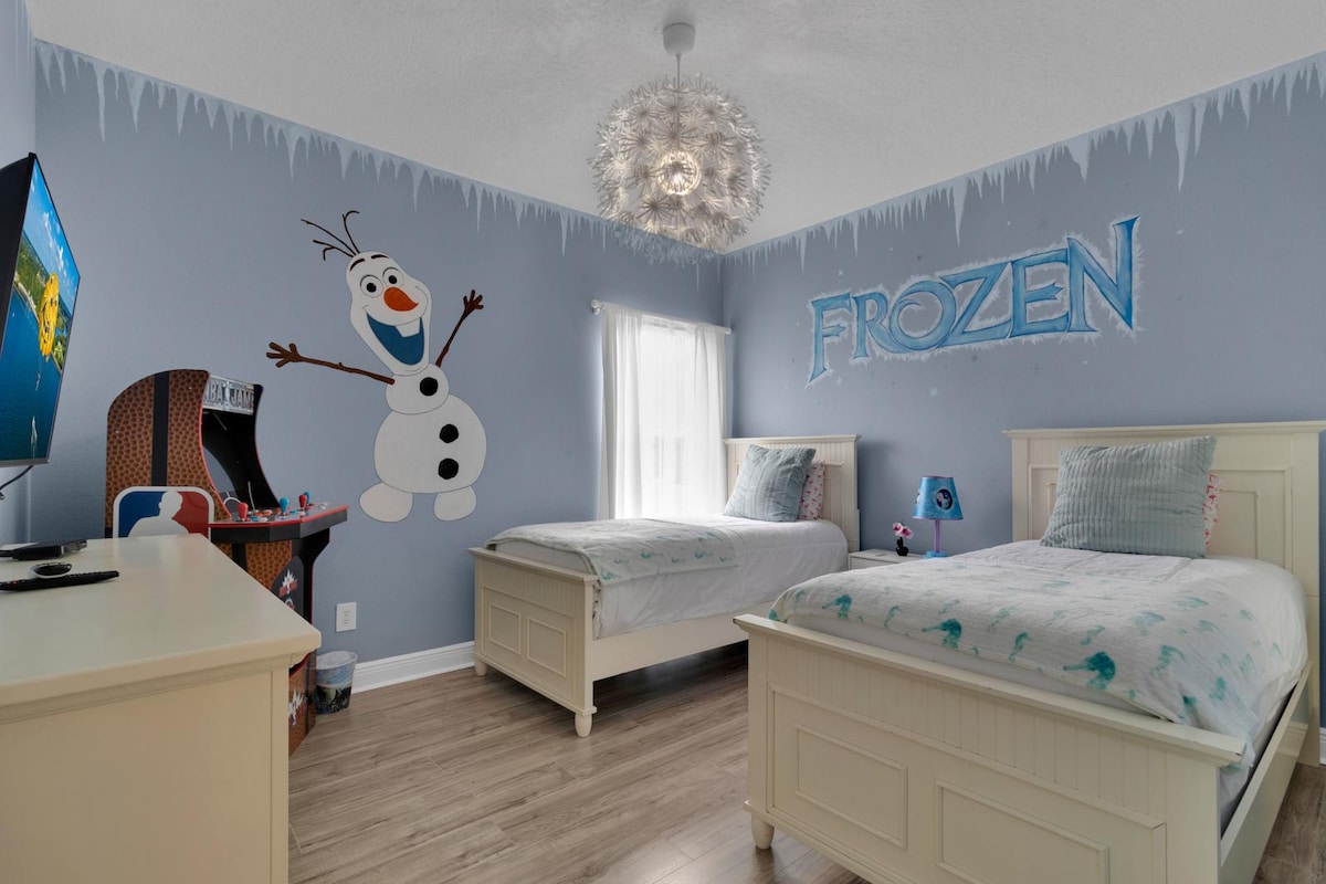 Perfect for families and group getaways, this spacious 5-bedroom, 5-bathroom themed villa in Reunion Village is just a 21-minute drive to Disney and comfortably sleeps up to 14 guests. Enjoy a private pool and a converted garage home theater, themed kids’ bedrooms, and stylish open living spaces. Located minutes from Disney, shopping, and dining, with access to select Reunion Resort community pools and amenities — this home blends comfort, fun, and convenience for an unforgettable Orlando stay.