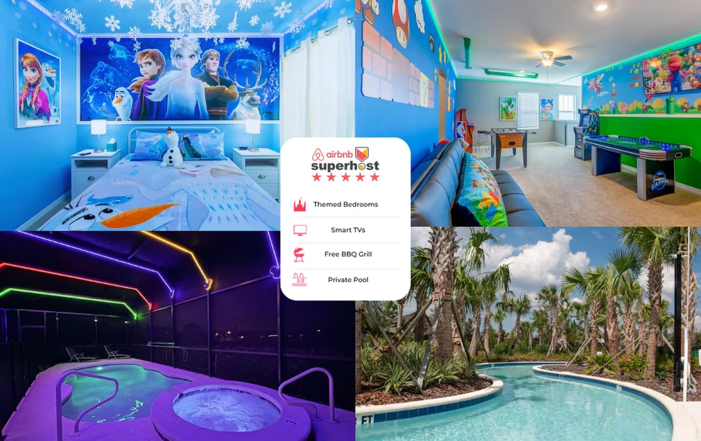 Enjoy our Early Bird Sale and Save! ✨ Discover an enchanting escape at Ice Saber Manor-a stunning 6 bed Villa featuring FROZEN and SPIDER-MAN rooms, 4 gorgeous master suites and endless entertainment options! Immerse yourself in cinematic wonders with a Star Wars MOVIE THEATER, belt out your favorites in the KARAOKE area or revel in our POOLSIDE THEATER! Relax in your heated POOL&SPA or enjoy our WATERPARK! Discover Disney from the comfort of this modern home nestled in a beautiful resort!