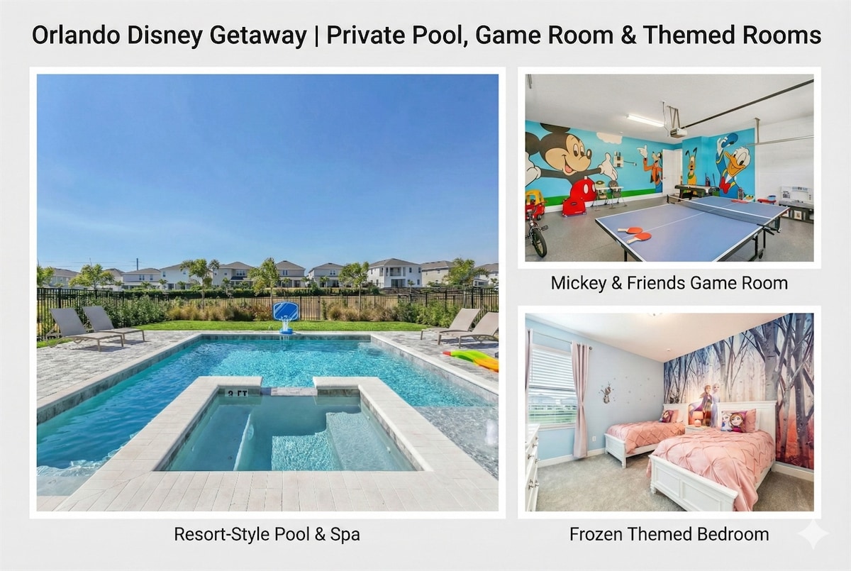 Luxurious villa in Kissimmee, FL perfect for families & groups! • Sleeps 16 with 6 bedrooms, 6.5 baths, 10 beds. • Enjoy a private pool & spa, game room with PS5, Nintendo Switch & arcade, home theater, gym & music station. • Two themed bedrooms bring Disney & Harry Potter magic to life. • Just 6.9 mi to Disney, 18.1 mi to Universal, 16.8 mi to SeaWorld, 29.6 mi to Legoland, 9.8 mi to Convention Center. • Note: NO access to waterpark at Encore Resort clubhouse.
