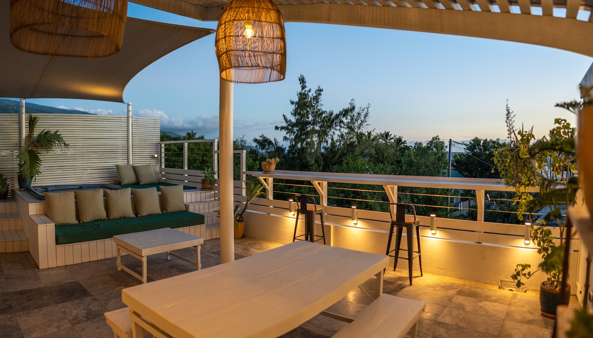 Tikaz Grand Bois à Saint-Pierre, à la jonction des quartiers typiques de Terre Sainte, Terre Rouge et Grand Bois....à 5min de la plus belle plage de l'île, Grand Anse. Vues mer, bassin privé, terrasses et jardinet, aire de stationnement privée et sécurisée. 1 chambre couchage 160 et espace bureau. 1 espace de vie avec canapé convertible ( couchage en 140 de qualité) , grande tv android, cuisine totalement équipée, espaces repas intérieur et extérieur, salle de bain complète.