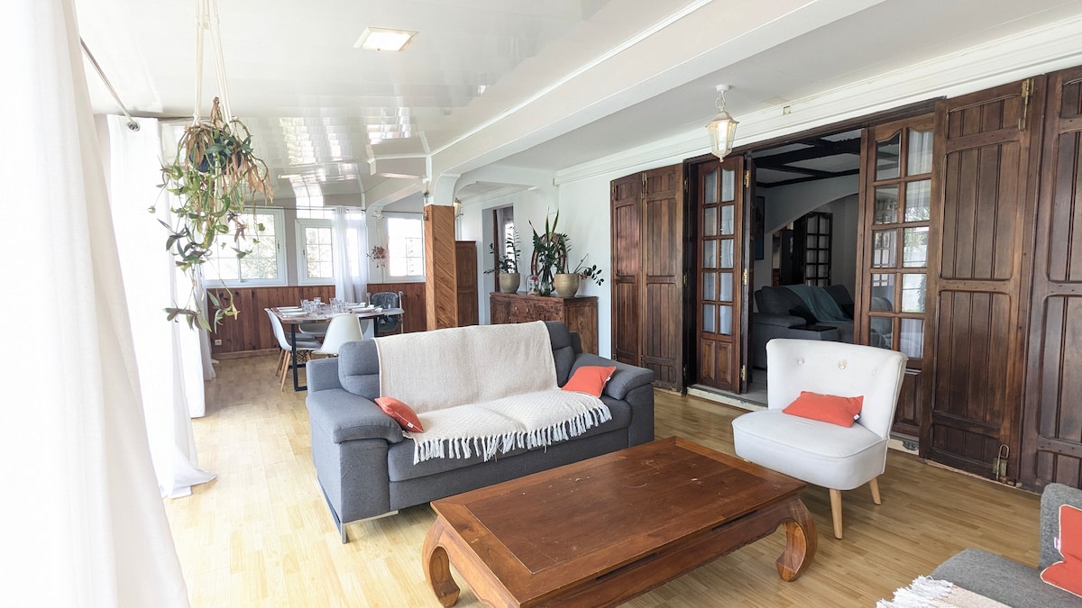 Bienvenue dans notre chalet chaleureux de 70m2, niché à 1200 m d'altitude à la Plaine des Cafres. Profitez d'un grand terrain fleuri et arboré de 1000m2, d'une piscine chauffée et d'une vue plongeante sur l'Océan Indien et le majestueux Piton des Neiges. Nous habitons également sur place et Mikilati sera ravie de vous préparez de bons petits plats et petit-déjeuners sur réservation, ou de vous partager nos bonnes adresses locales. Idéal pour les randonnées au Volcan, Grand Bassin, etc...